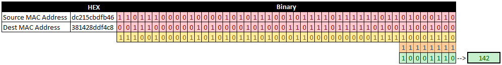 So what does this mean for our hashing algorithm? First, we'll take the two MAC addresses (RED), perform a bitwise XOR operation on them (YELLOW), keep only the eight least significant bits by taking a bitwise AND with 11111111 (255) (ORANGE) (Remember those CCNA studies where you had to subnet by hand? This was bitwise ANDing 🤯). What we are left with is a resulting set of zeros and ones, that we can represent as an integer (142 in this example) (GREEN).