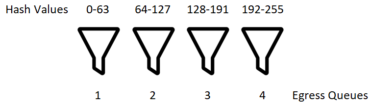 The hard part is done now and its time to deposit the frames into the various egress queues in order to have the egress interfaces send them out on the wire. This is done by taking the number of supported interfaces in a bundle on our switching platform, the number of interfaces that are active in the bundle, and the hash value from all of the previous work. We can then divide the number of queues by the number of active interfaces to get our mapping from hash value to egress queue. See the below diagram which helps to illustrate the point.